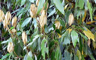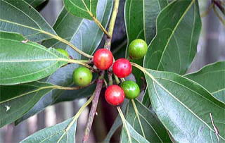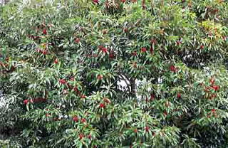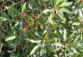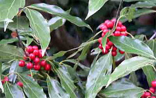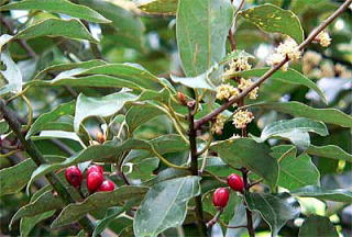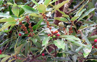 山野に生える常緑高木ですが、花が秋に咲き、果実は翌年秋に赤熟しますので、花と前年の果実が同時に見られる面白い木です。