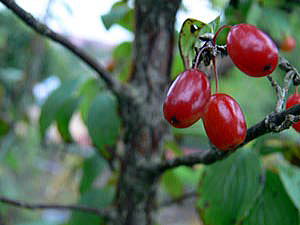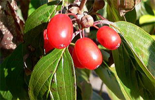 その後、2008年に、県薬草・地域作物センターのサンシュユが赤い果実をつけていましたので、写真を追加しました(最下段の2枚の写真)。