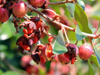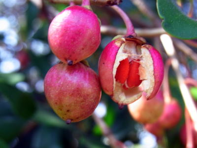 この赤い果実は、やがて裂け、赤い種子が見える頃はさらに目立ちます。