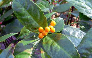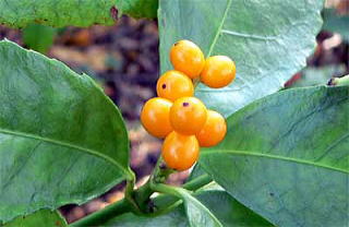 センリョウは赤い実をつけますが、変種とされるキミノセンリョウは、写真のようにきれいに黄熟します。 たまたま、延岡植物園にありましたので、記録のため撮影しました。