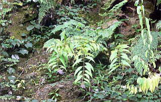 加江田渓谷の遊歩道の頭上、崖の側壁から垂れ下がるようにして咲いていました。