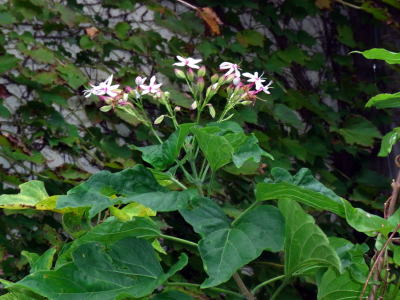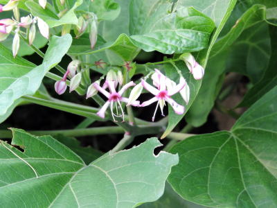 近寄って観察してみると、花も、クサギによく似ていますが、葉の基部が心形で、先が尖っており、クサギと少し違う印象を受けました。
