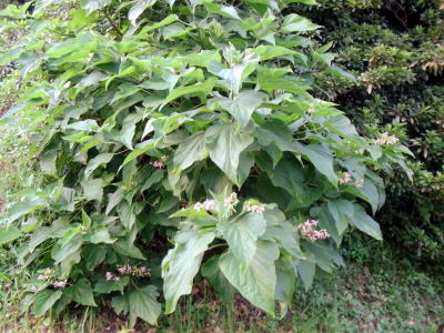 日南海岸沿いの道の駅で、クサギに似ていますが、クサギよりも大きな葉をつけた植物が丘の斜面に生えているのを見かけました。