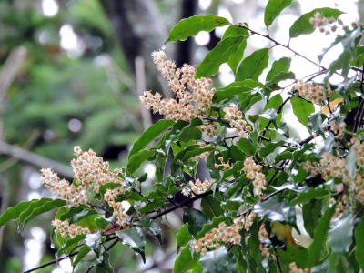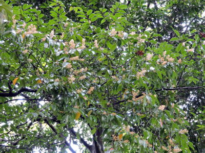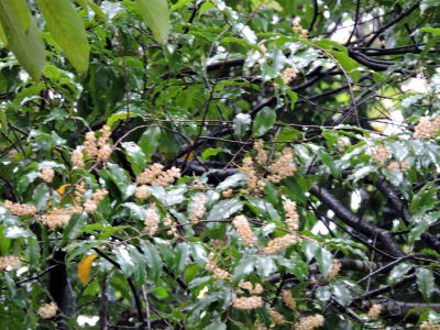 下見のつもりで、リンボクの木を見上げたところ、驚いたことに、たくさんの白っぽい花房が枝先で揺れ、見事に開花しているではありませんか。