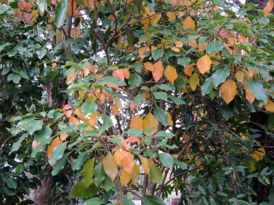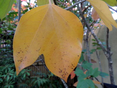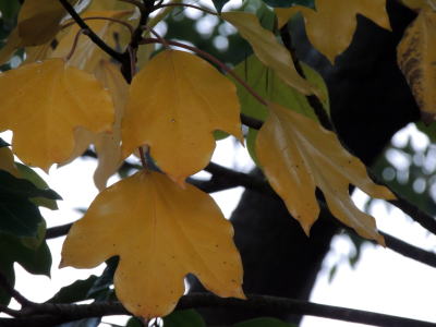 しばしば庭木として栽植されるカクレミノは、常緑小高木ですが、花の少ないこの時期、公園などのあちこちで、黄葉を見かけることがあります。
