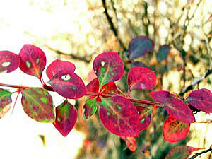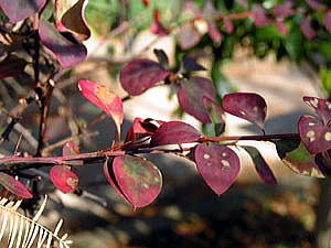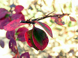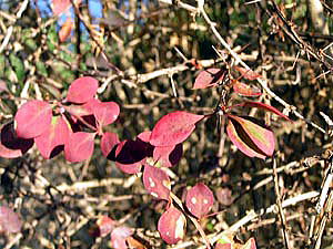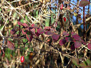 08年、すでに12月半ばを過ぎていましたが、見事に紅葉しているメギを観察できましたので、赤熟した実も一緒に撮影しました。