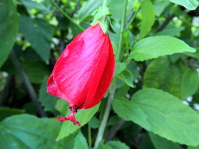 マルバビスカスの花は、ねじれて三分咲きのまま終わる変わり者です。