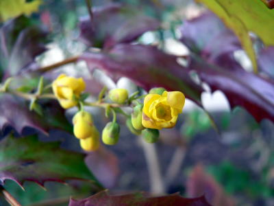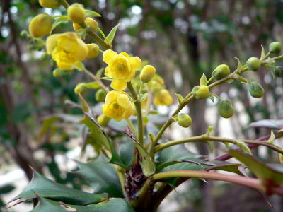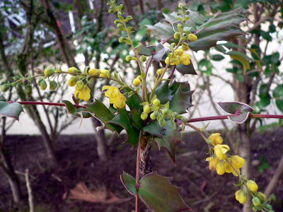 2月末になると、早春の花が咲き始めますが、ヒイラギナンテンの黄色い花が遠くからも目立ちました。