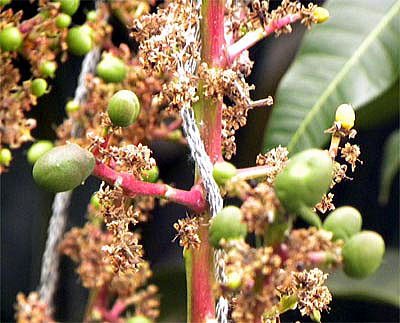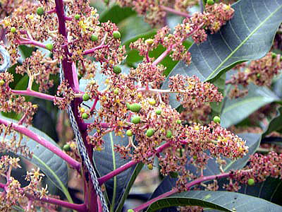 2010年4月、まだまだ小さいのですが、マンゴーの幼果を撮影しましたので、花とともに写真を追加しました(下の2枚の写真)。