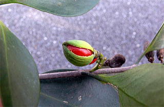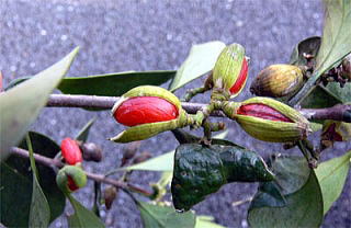 さく果は長さ1.5〜2cm、熟せば革質の果皮が2つに裂け、赤い種子が1個現れます。