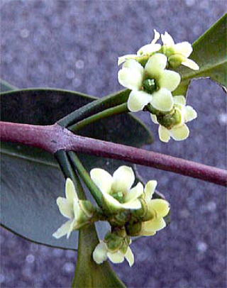 花は早春、葉えきに7〜12mmの柄をつけ、集散状に数個つけます。