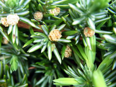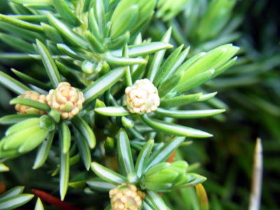 花は初夏に咲くそうですが、2014年4月、庭園のグランドカバーのハイネズに花が咲いていました。