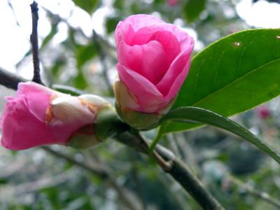 残念なことに、今年は、どの花びらも霜や雪で傷んでしまい、日本の椿にない色の薄紫を帯びた透きとおるような淡紅色の花びらの様子を観察できませんでした。