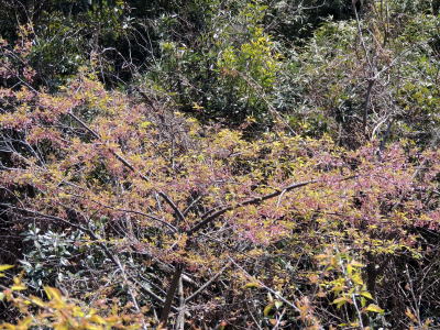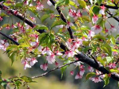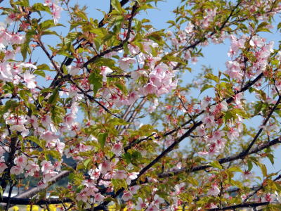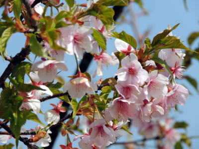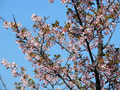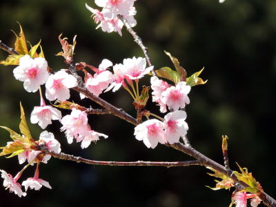 古い葉を枝先に纏ったまま開花した木も何本か見られ、河津桜特有の新葉も今出たばかりの目立たない小さな新葉でした。