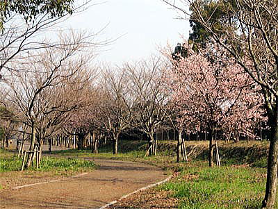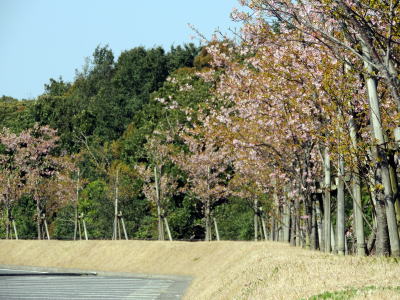プロ野球の春季キャンプを早咲きのサクラで歓迎しようと、数十本の河津桜が一列に並べて植えられ、毎年2月初めに咲き始めるそうです。