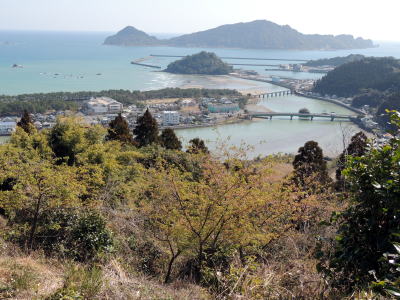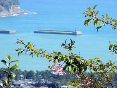 城跡の手作りベンチに腰を下ろすと、遠くの入り江を背景に河津桜の広がる枝々が眼下に飛び込んできます。