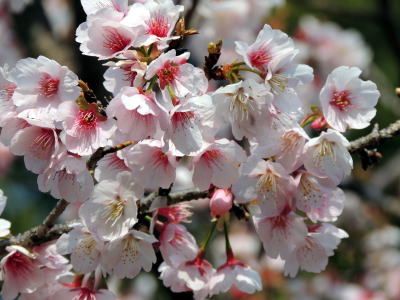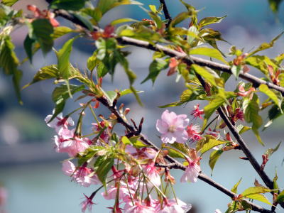 河津桜は、オオシマザクラ系とカンヒザクラ系のサクラの自然交配種と推定されている早咲きのサクラです。