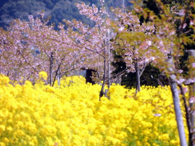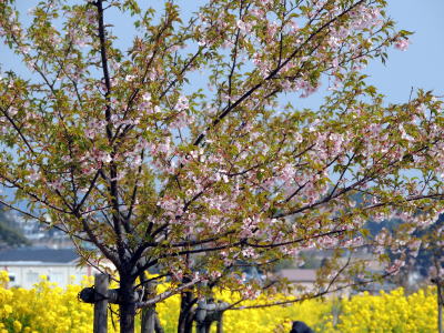 五ヶ瀬川右岸沿いの堤防遊歩道1.5kmの菜の花畑を縁取るように、300本の河津桜がズラリと植えられています。