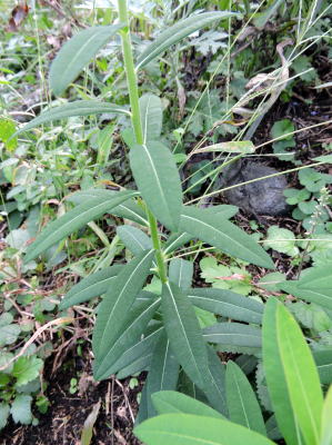 茎は、切ると白い汁が出る。上部には毛があり、直立し、高さ30~70cm。