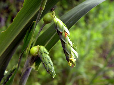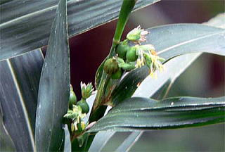 花は初秋、葉えきから長短不同の柄をもつ花穂をつけ、雌小穂は1花のみで、両側に退化、小穂を伴い、壷形の苞鞘内にあり、雄小穂は2花からなるそうです。