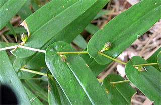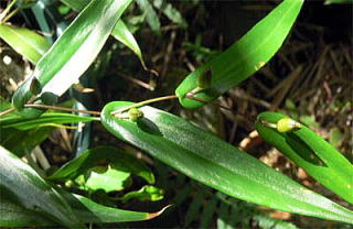 茎の長さは50〜100cm、葉は、披針形で光沢があり、2列に並んでいます。