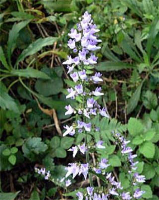 アキノタムラソウ と同時期に咲き、同じような紫色の花色で、よく似ていますが、アキノタムラソウは複葉、花は輪生するのに対し、ヤマハッカは単葉、花は茎の片方に片寄って集まります。