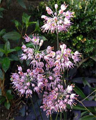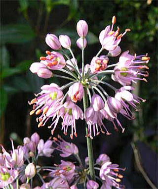 花は晩秋、葉の間から高さ30〜50cmの強い茎を1本出し、多数の紅紫花を束生して咲かせます。