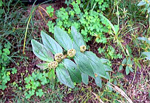 葉は対生し,長さ2.5〜4cm,幅0.8〜2cmの卵形あるいは広卵形。表面は多少赤褐色を帯びた青緑色で、裏面は黄緑色。
