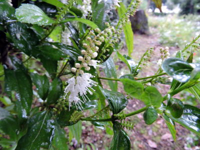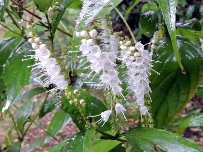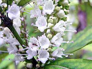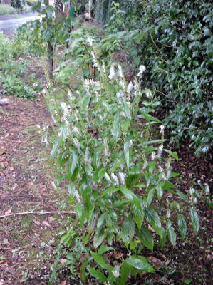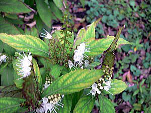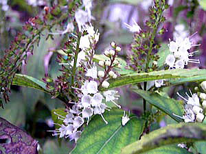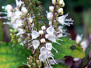 シソ科の植物らしく、秋に、花序の一方に向かって真っ白い美しい花を咲かせます。