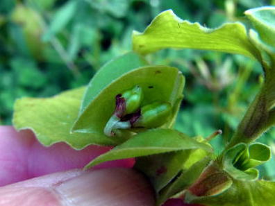 葉は、卵形または広卵形、辺縁は波状、茎と同様な毛が両面にあり、長さ3〜7cm。