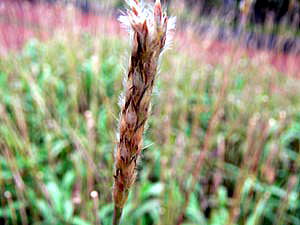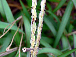 長さ 6cm位の紫赤色を帯びた2個の花穂を平行してつけ,小穂は長さ 6mm位,肥厚した軸の各節に有柄・無柄が対になってつく。