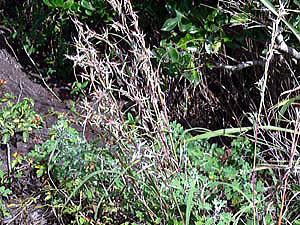 木花海岸沿いのオガルカヤは、高さ1mで、びっしりと小さな花をつけていましたが、美々津海岸のオガルカヤは、きびしい自然環境のせいか、どれもその半分ほどの草丈しかありません。