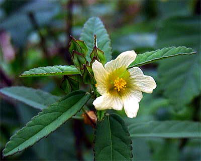 花は、葉えきに1個ずつつく。花冠は濃黄色で径1cmほど,がくは5裂し,裂片は三角形。花弁は5枚。種子は腎形,長さ2mmほどで黒色を帯びる。