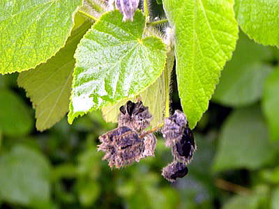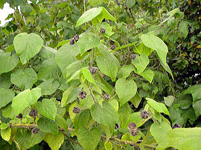 翌々年の6月末、同じ場所のイチビに、ユニークな形をした果実がびっしりとついているのを見つけましたので、写真を追加しました(下の3枚の写真)。