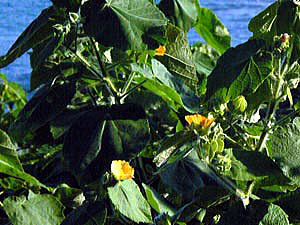 そのイチビが、日南海岸の青い海と鬼の洗濯岩を背に、黄色い花を一斉に咲かせて、勢いよく群生しているのを見かけ、驚きました。