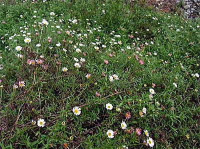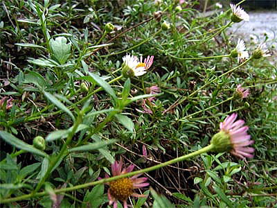 空き地のコンクリート脇に生え、ヒメジョオンに似た小さな可愛らしい花を次々と咲かせ、多年草の帰化植物らしく、石ころに混じって年々たくましく繁殖を続けているようです。