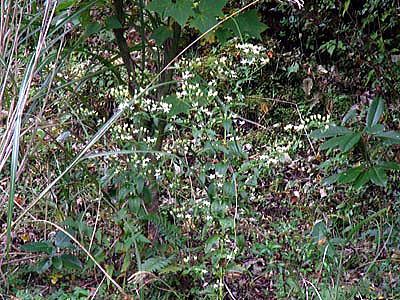 霧島・えびの方面を散策中に、08年10月 、初めて観察したアケボノソウのポイントから2〜3km下手の道路際で、花をたくさん咲かせている数株のアケボノソウを見かけました。