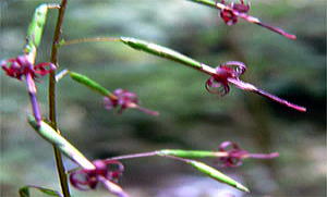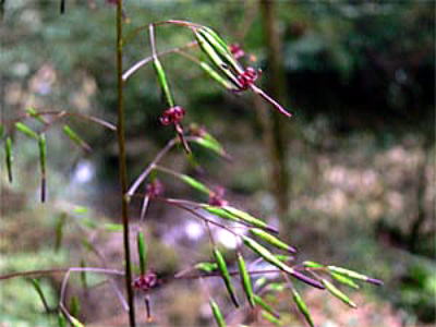 花は、円錐花序に多数ついて下垂し、黒紫色で径約5mm。