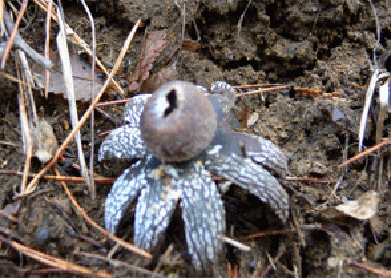 外皮は、星形に開き、乾湿によって開閉し、林の中の道端や土の崖などに発生するキノコです。