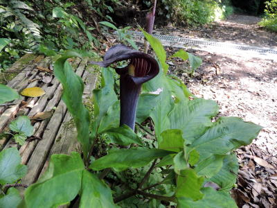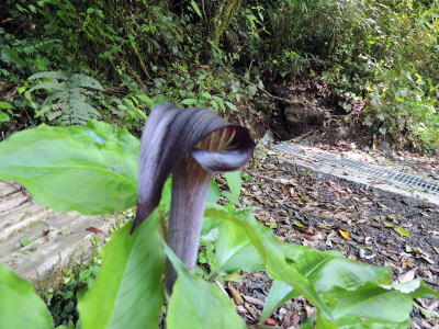 小林市の三之宮峡を散策した際、遊歩道入り口付近で、マムシグサやウラシマソウに似たサトイモ科の特徴のある仏炎苞が多く目につきました。