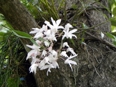 西米良村村所にある菊池記念館の庭園で、『ハビロガシ』 と標示されたカシの幹にセッコクが着生しているのを見つけました。