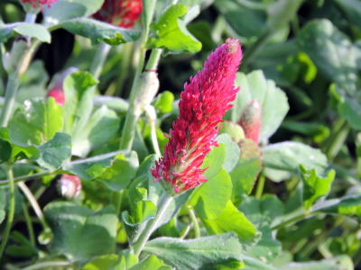 植物散策中、道沿いの菜園の隅で、深紅色の穂状の花を多数つけている見慣れない植物を見かけました。