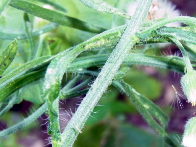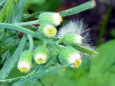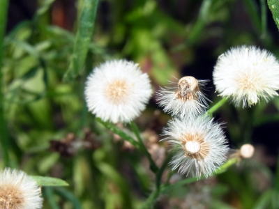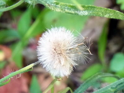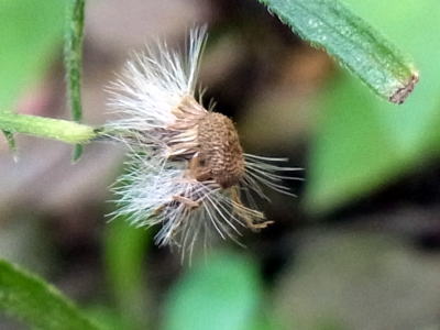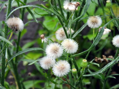 蕾も未だたくさんつけ、頭花も開花し続けていましたが、白い冠毛を纏った球形の果実をつけた果序がよく目立ち、印象的です(3段目右側の写真)。