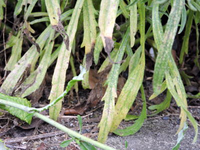 蕾らしきものを頂生し、線形の細長い葉は灰白色を帯びた緑色をしています。