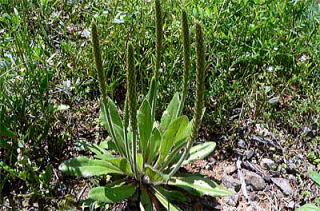 オオバコに似ていますが、全体に白い毛が多く、葉はへら形です。