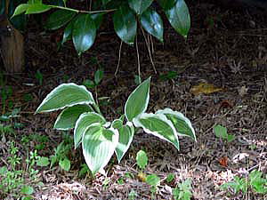 図鑑やインターネットで調べた結果、園芸種のホスタ(ギボウシ)パトリオットではないかと思われたので、一応、園芸種名で、載せておきます。