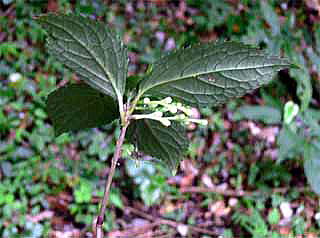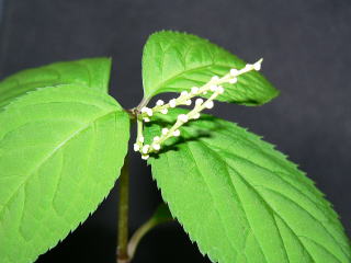 花は、茎の先に2本の穂状花序を出し、小さな白い花をつけています。