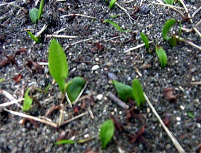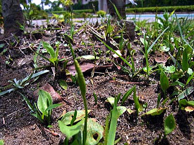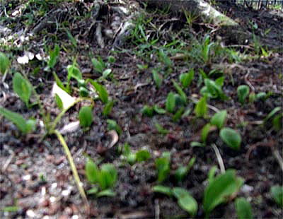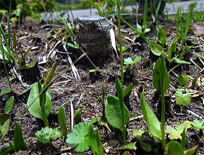 公園内の緑地帯を散策中、小さい単葉のみの見慣れない植物が一斉に顔を出しているのを見つけました。