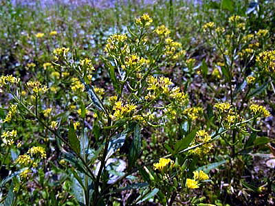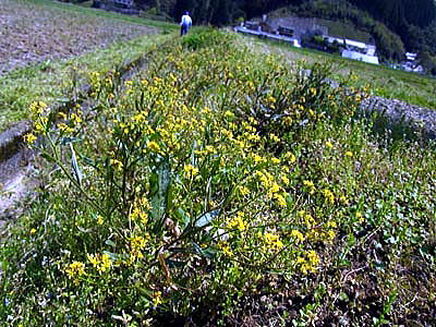 傍らに、イヌガラシか、カラシナかと思われる濃い黄色の花をつけたアブラナ科のやや大型の植物が群生しているのを見つけました。