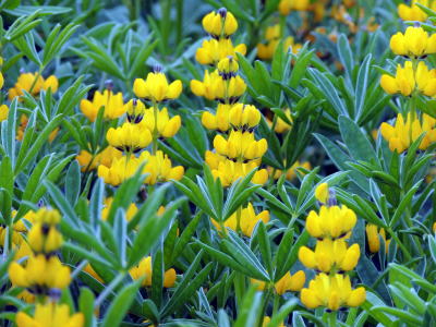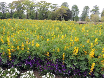 園内の一角で、鮮やかな黄色いキバナルピナスが一斉に開花していました。